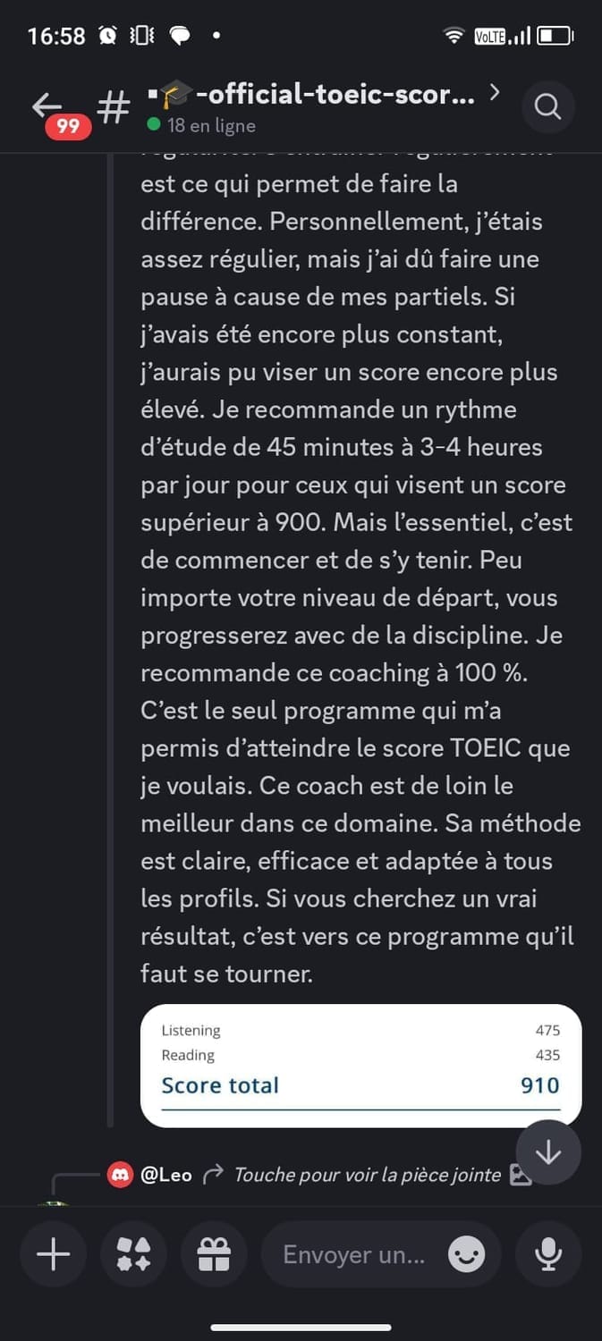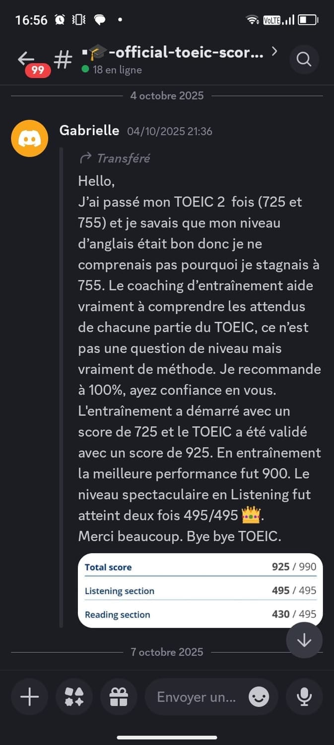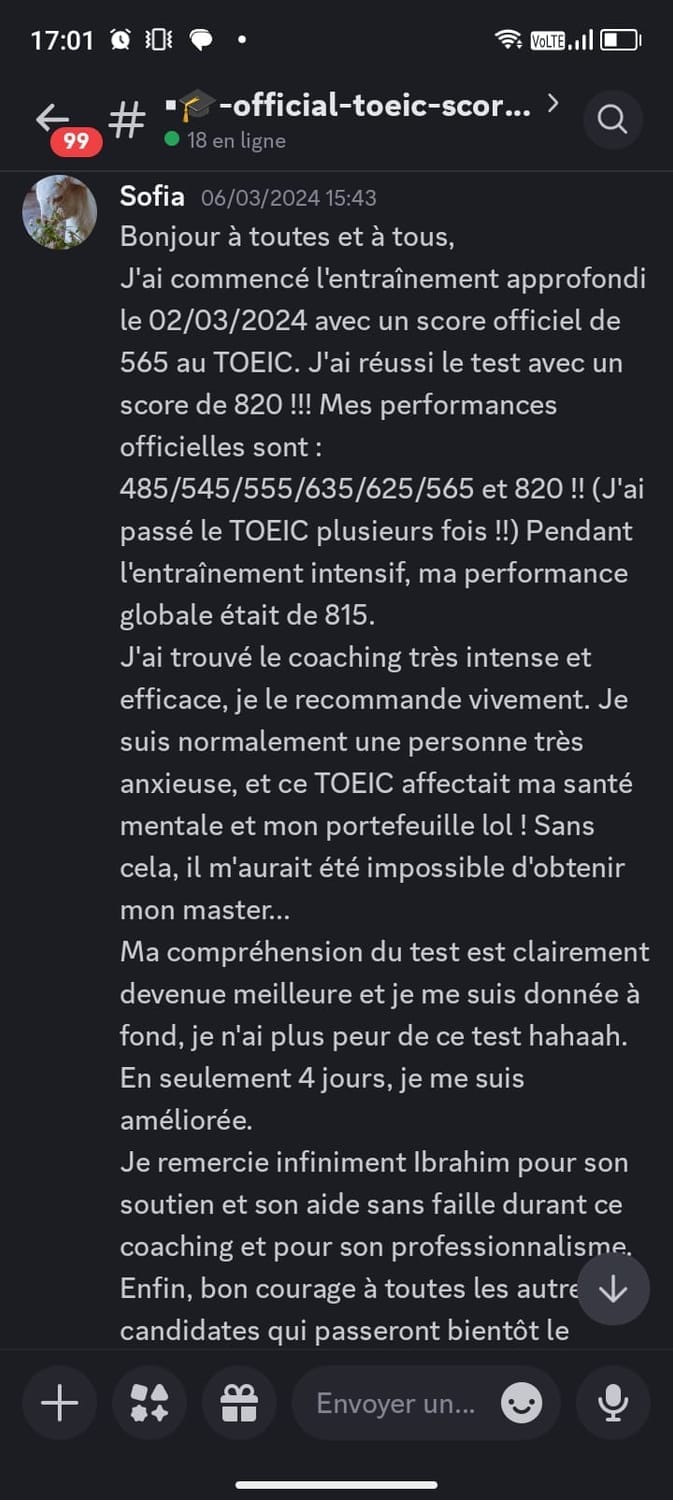 Durée du coaching ajustée en fonction de la date de votre test officiel du TOEIC.